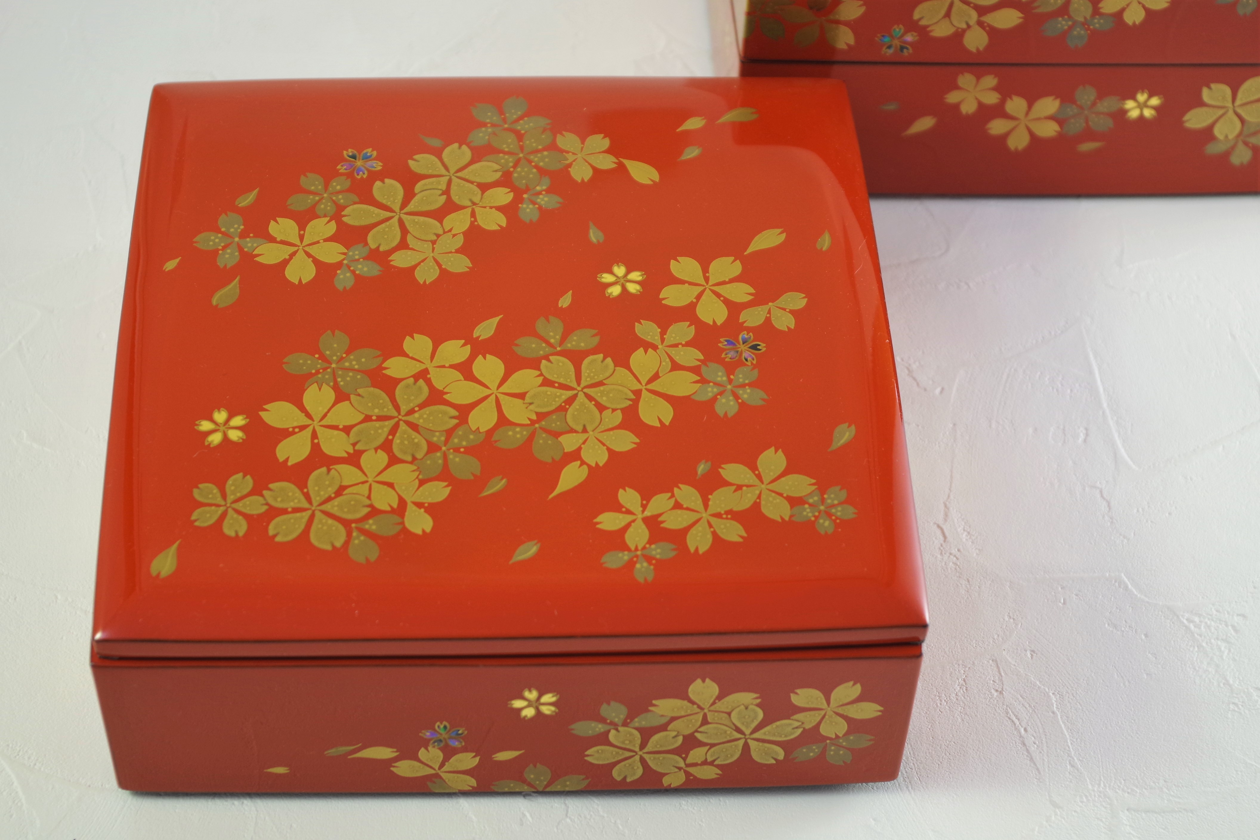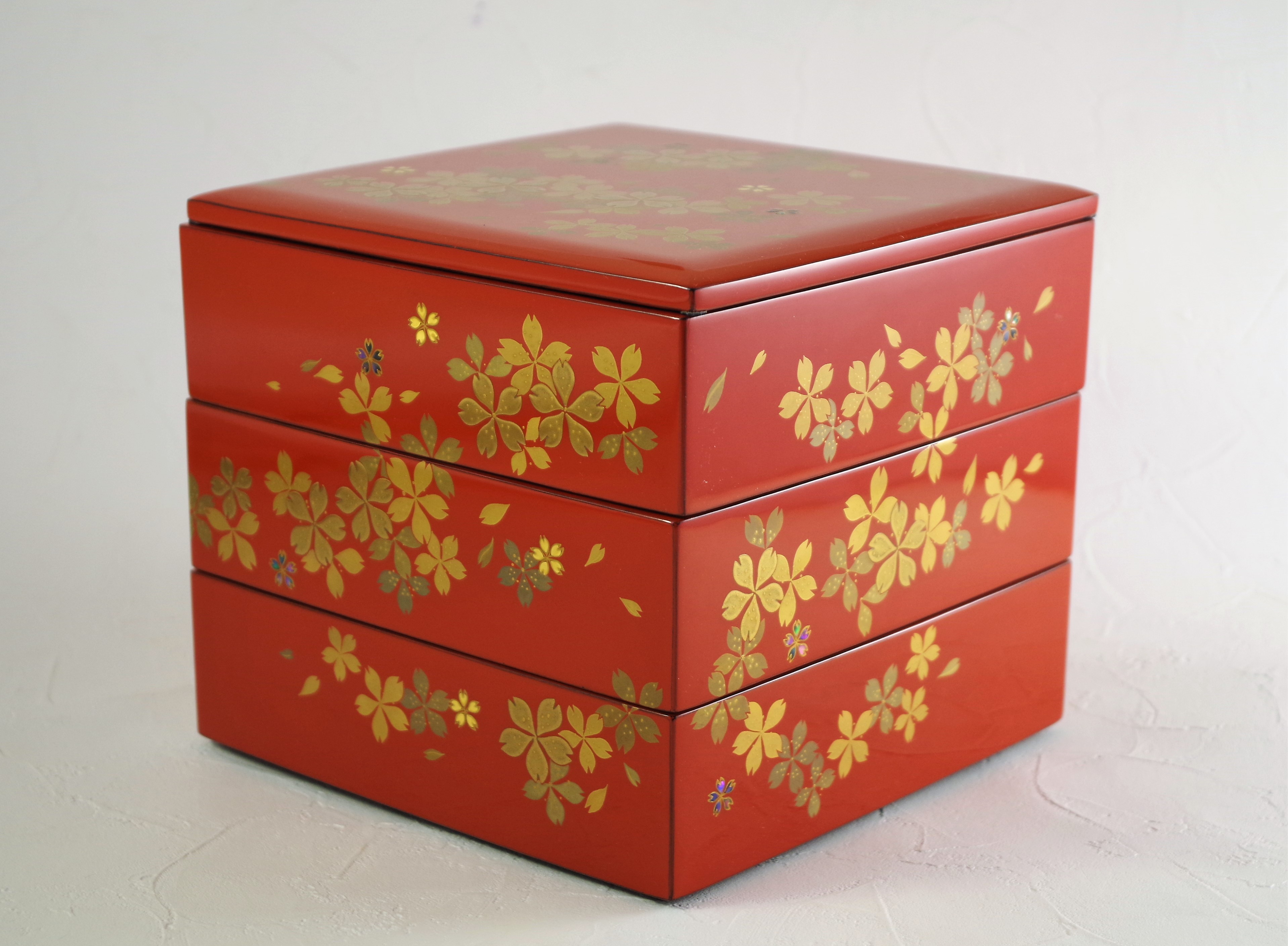 朱色の三段重に金や螺鈿(貝)で艶やかに加飾された