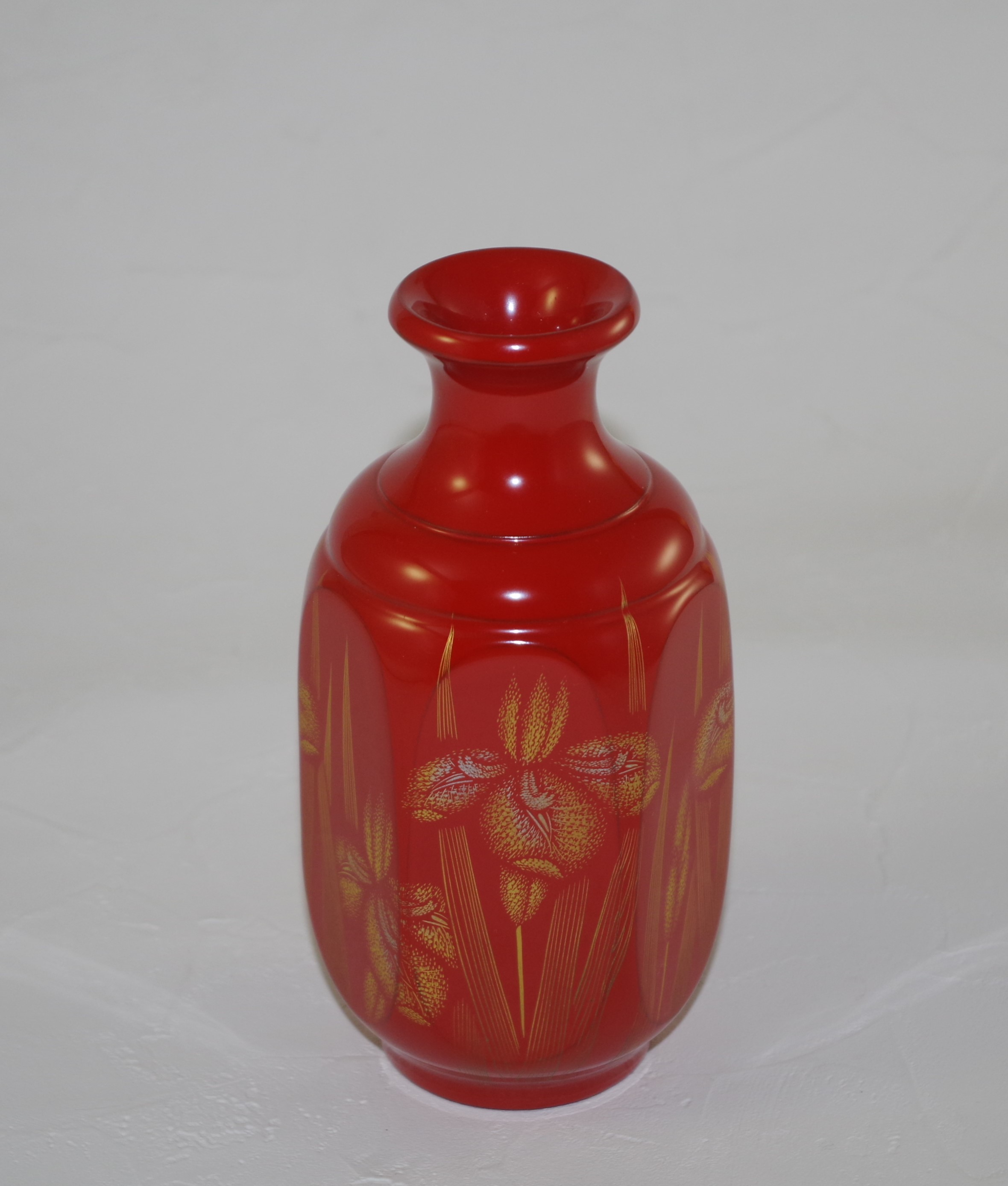 赤の徳利にアヤメ沈金が細かく描かれています。